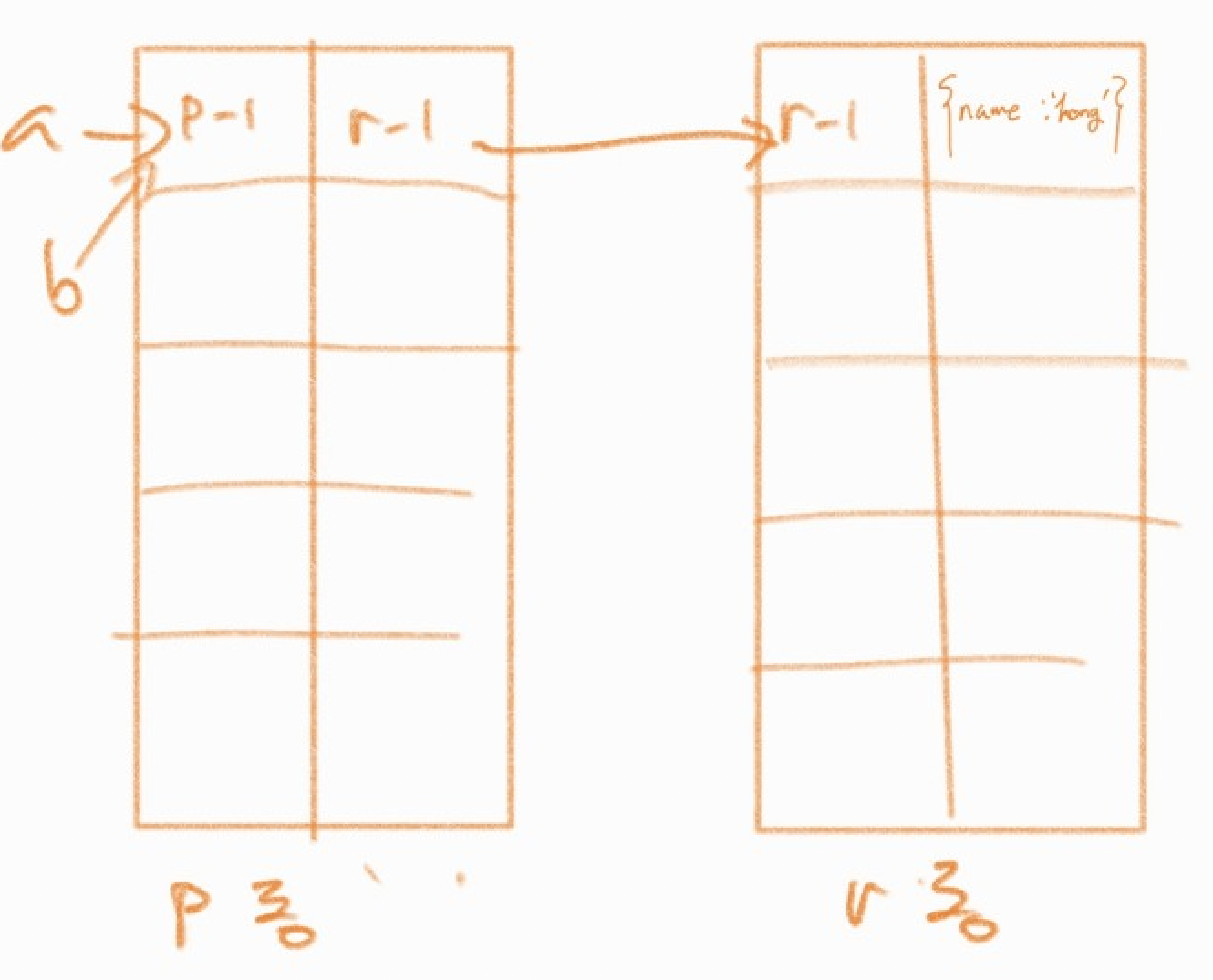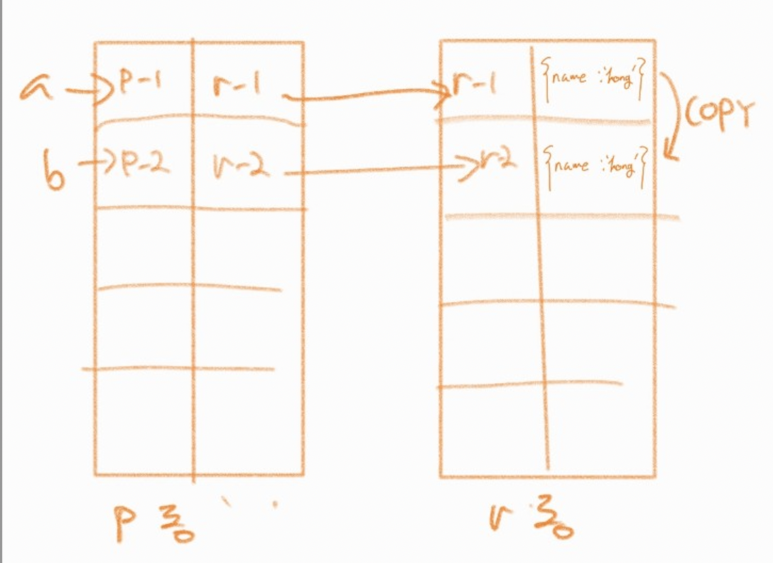 즉, 변수 a와 b는 p동에 저장된 r동의 주소값을 통해 데이터를 참조한다.