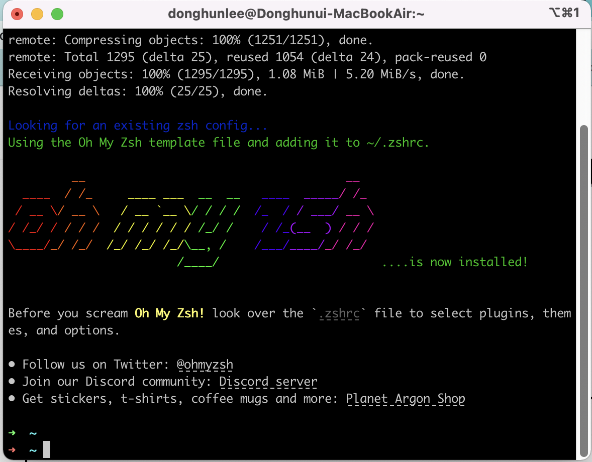 $ sh -c "$(curl -fsSL https://raw.githubusercontent.com/robbyrussell/oh-my-zsh/master/tools/install.sh)"