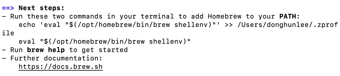 $ echo 'eval "$(/opt/homebrew/bin/brew shellenv)"' >> /Users/donghunlee/.zprofile