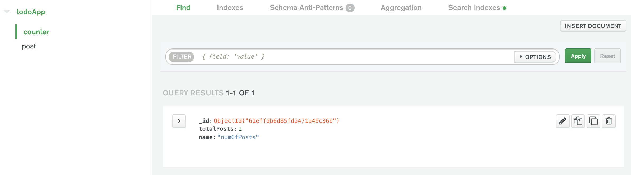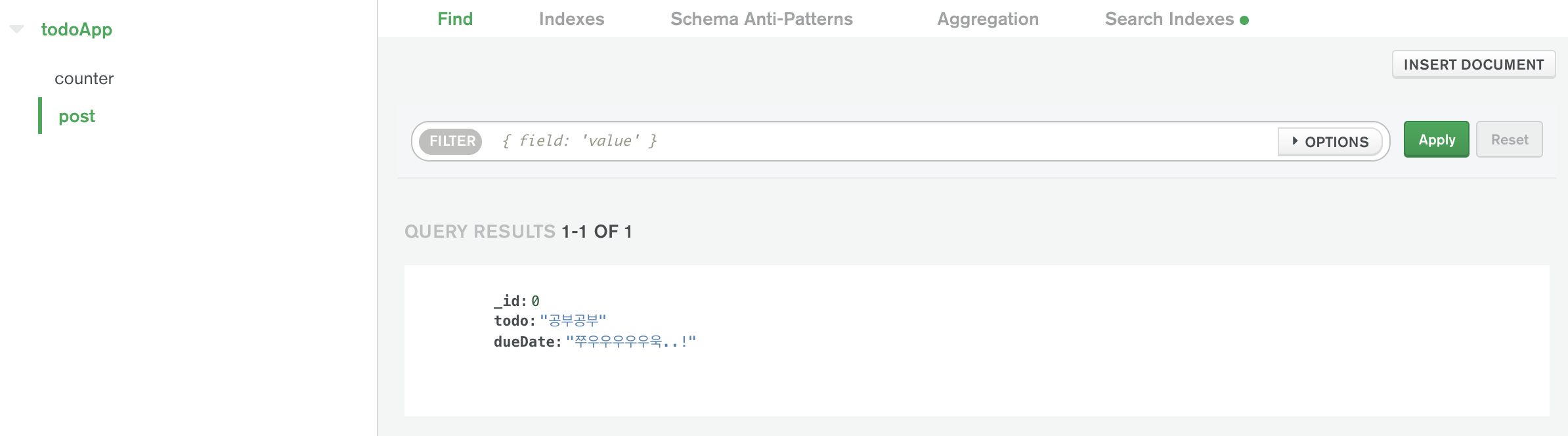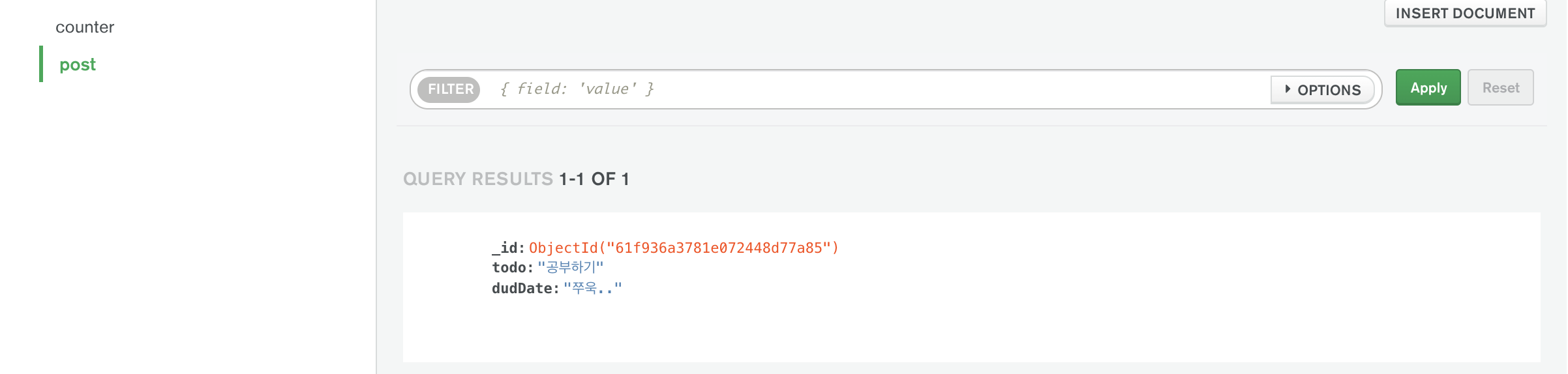 데이터베이스에서 _id 가 1인 데이터를 찾아서
