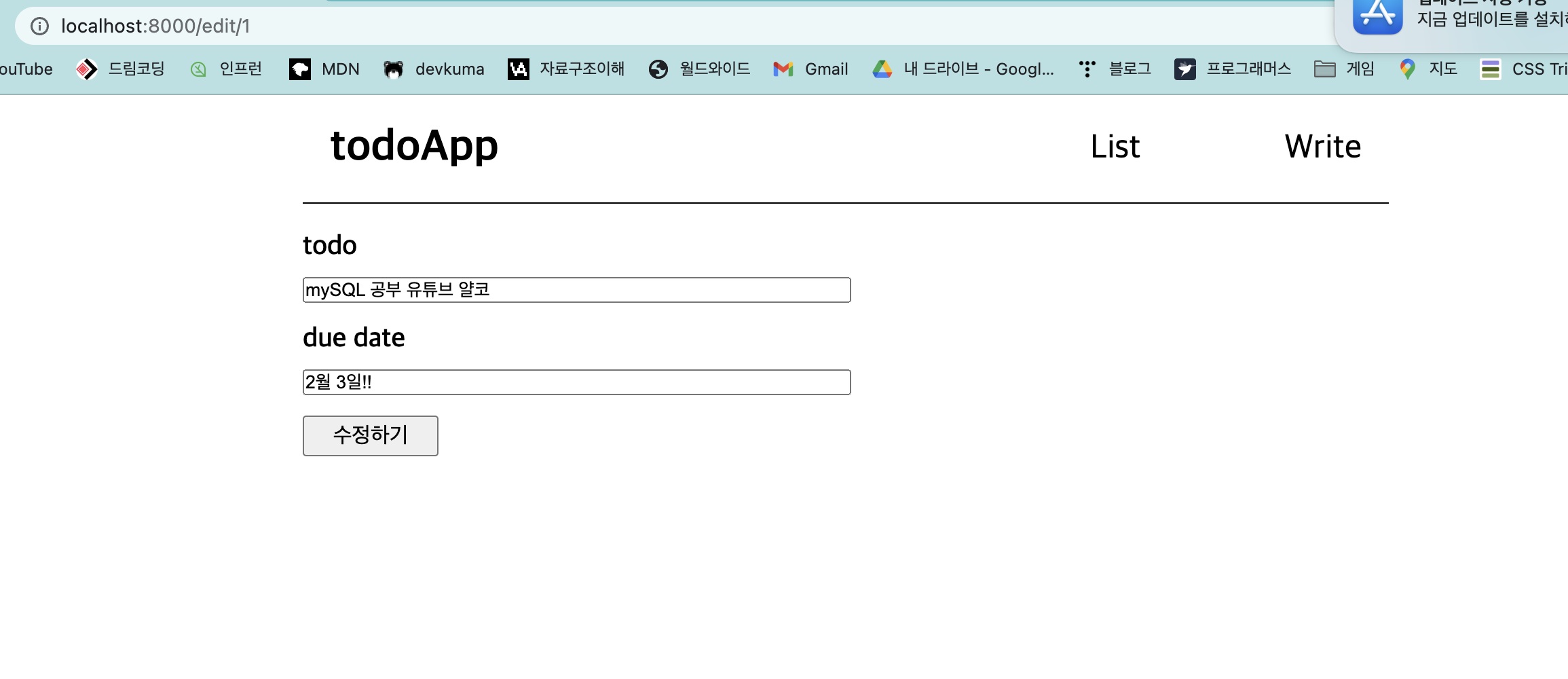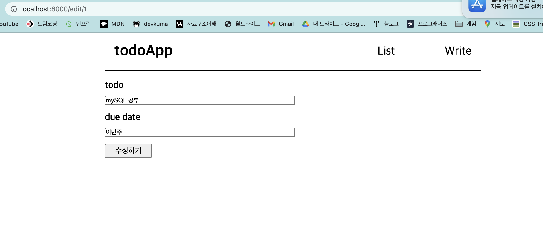 post 요청을 받은 /edit 은 수정된 내용을 데이터베이스에 덮어씌울 것이다.