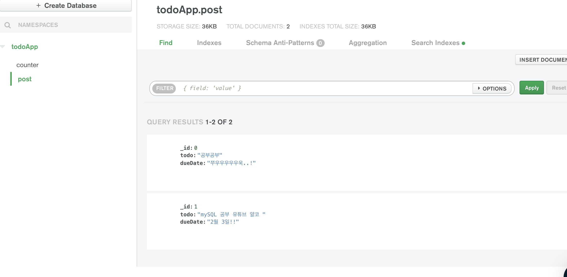 데이터 베이스는 noSQL인 mongoDB를 사용한다.