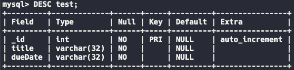 title과 dueDate 옆의 NOT NULL 은 값이 NULL 즉 입력되지않는 것을 허용하지 않겠다는 의미이다.