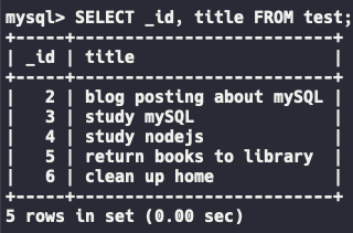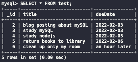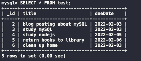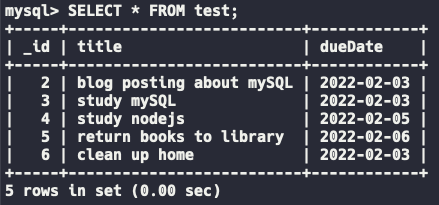 $ SELECT _id, title AS todo, dueDate FROM test;