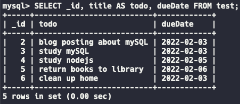$ SELECT _id, title AS todo, dueDate FROM test;