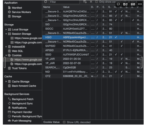 그리고 저장되어있는 내용 중 쿠키라는 것을 확인할 수 있다.