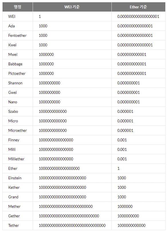 이더리움은 사용하는 단위가 굉장히 많다.