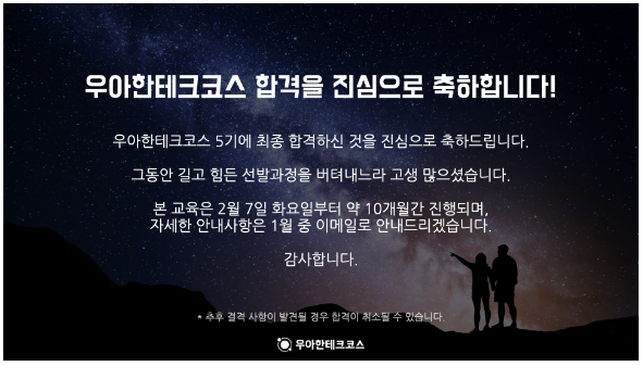 우테코 5기 지원자 분들께는 당락의 결과와는 상관없이 너무 수고하셨고, 고생하셨고, 고맙다는 말을 전하고 싶다.