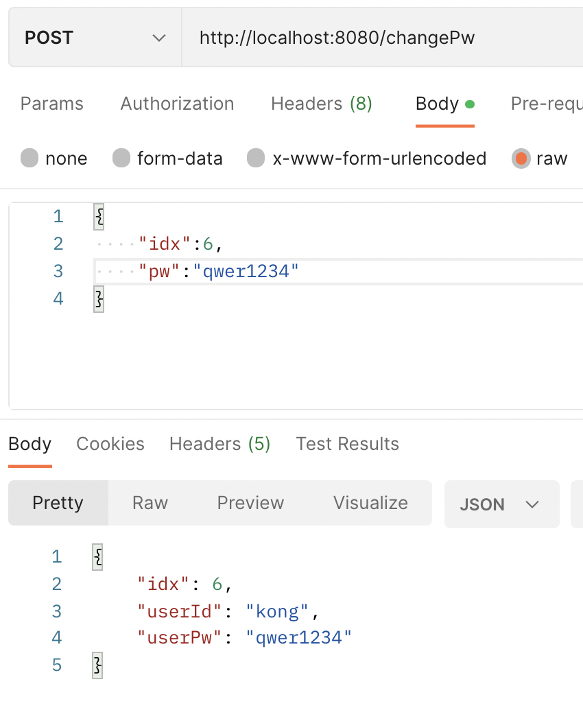 return userService.updatePassword(pwDto.getIdx(), pwDto.getPw());