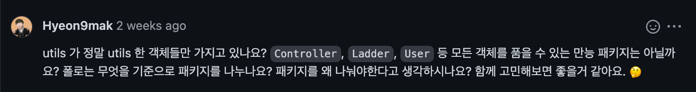 평소 아무 생각없이 utils 패키지를 만들고, 그 안에 Validator 클래스를 두어 검증로직을 관리했다. 사다리미션 역시 마찬가지의 방식으로 패키지를 구성했었다. 그리고 이에 대해 이번 리뷰어는 Validator 클래스가 정말 utils 패키지에 어울리는지에 대한 의문을 안겨줌과 동시에 utils 패키지의 역할에 대한 의문 또한 안겨주었다. 그냥 너무나도 흔하게 사용하고 자주 사용하다보니, util이란 패키지 또는 클래스에 대해 한번도 깊게 생각해본적이 없는 것 같다. 우테코는 나에게 정말 많은 의문들을 안겨준다. 해결은 내 몫이니 파고들어보자.