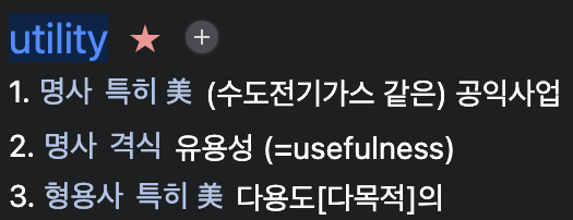 util 이 util한가? 라는 문장을 곱씹고 있다보니, util의 뜻을 내가 잘못 알고 있는게 아닌가 싶어서 바로 네이버 영어사전을 뒤져봤다. 뭐 당연한 얘기지만 util이란 단어는 사전에 존재하지 않는다. utility를 줄여서 흔히 util이라 부르기 때문에 utility의 뜻을 검색해봤다.
