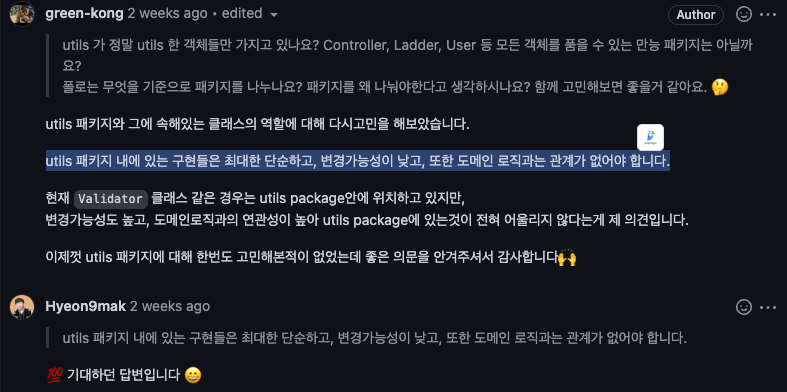 해당 내용바탕으로 고민의 내용을 정리해서, 리뷰어에게 답변을 남겼다.